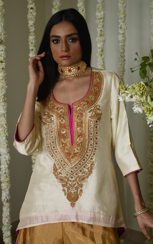 Begum kurta in Deep Ivory Silk with Gold Garara.
