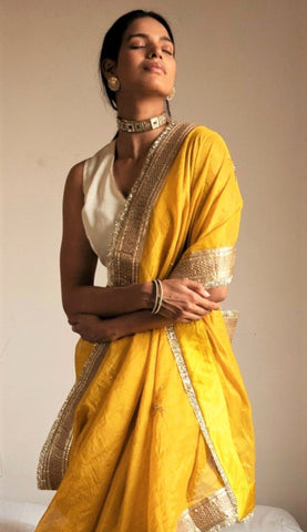 Presenting the Sari from Shorshe's Exquisite Summer Festive Collection SHAKKAR. This includes Sari in Yellow Handloom Tissue embellished with hand embroidery and lace trims.
