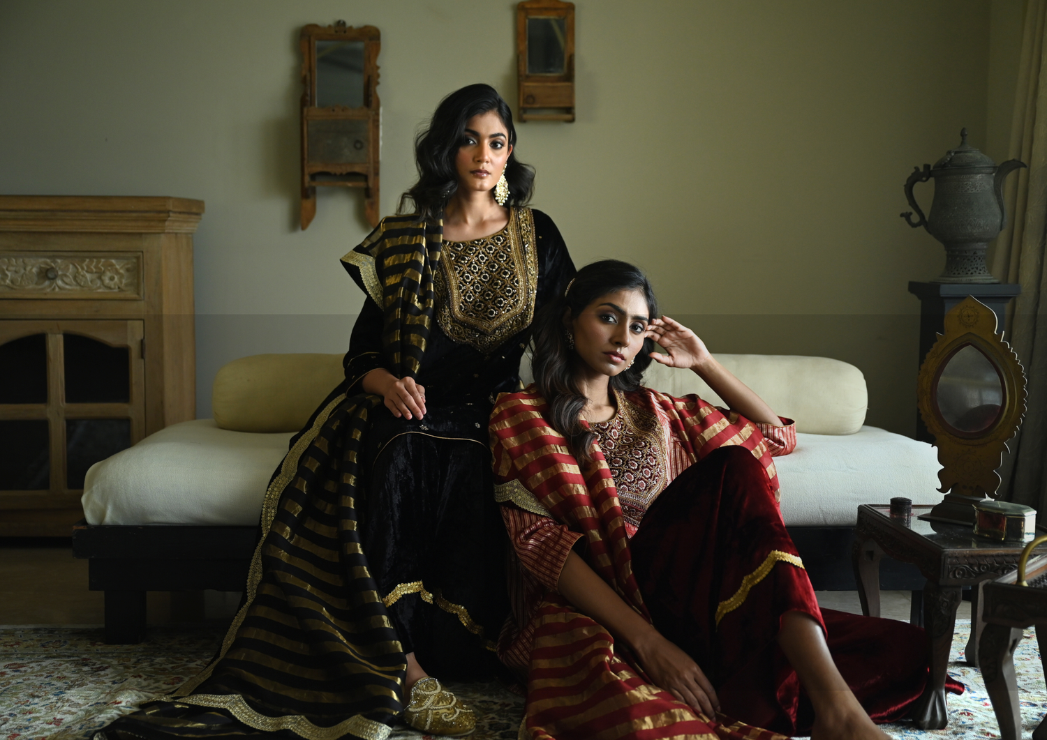 In beautiful bold black & deep gold, sindoori reds, the colors are royal & embellished with zardosi & dabka embroidery.