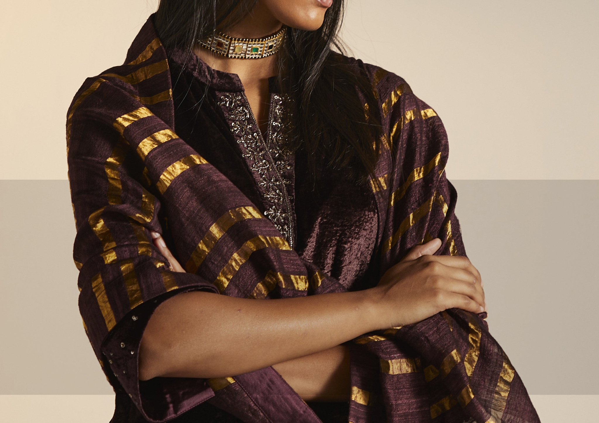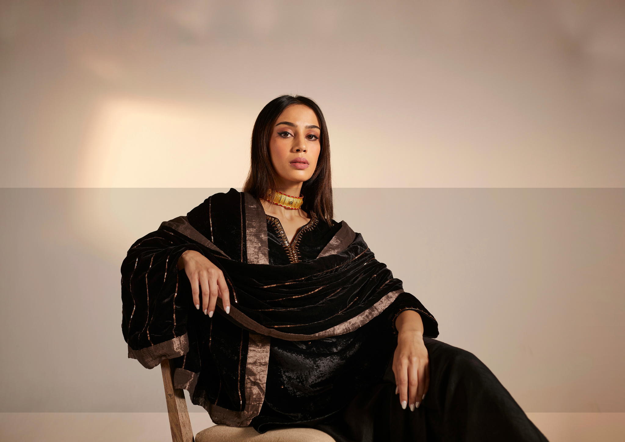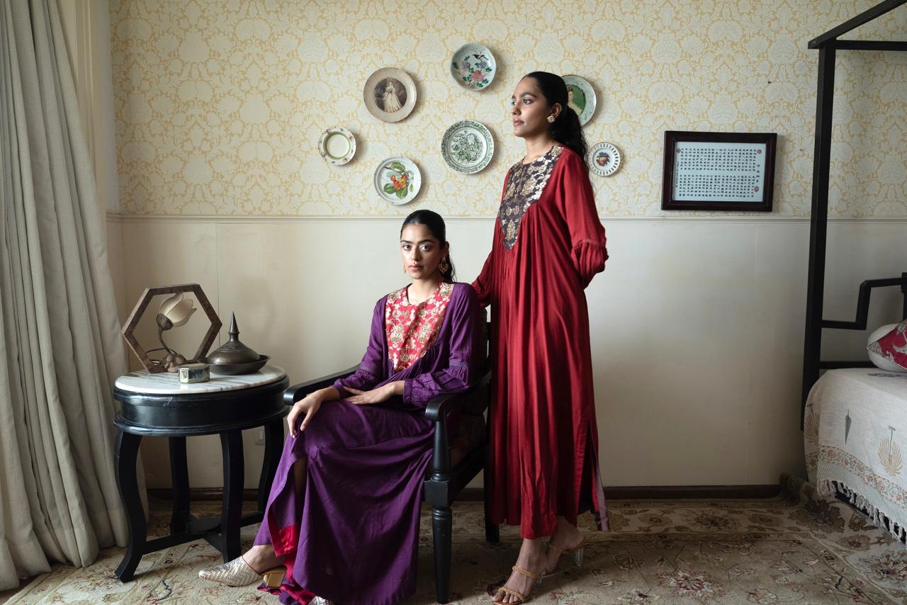 RUMI — a poetic, vision for your winter festivities from Shorshe. In beautiful bold black & deep gold, sindoori reds, the colors are royal & embellished with zardosi & dabka embroidery.The silhouettes are crafted for women who celebrate with grace. This season, glow in a quiet, romantic way only poetry does in Shorshe’s RUMI.