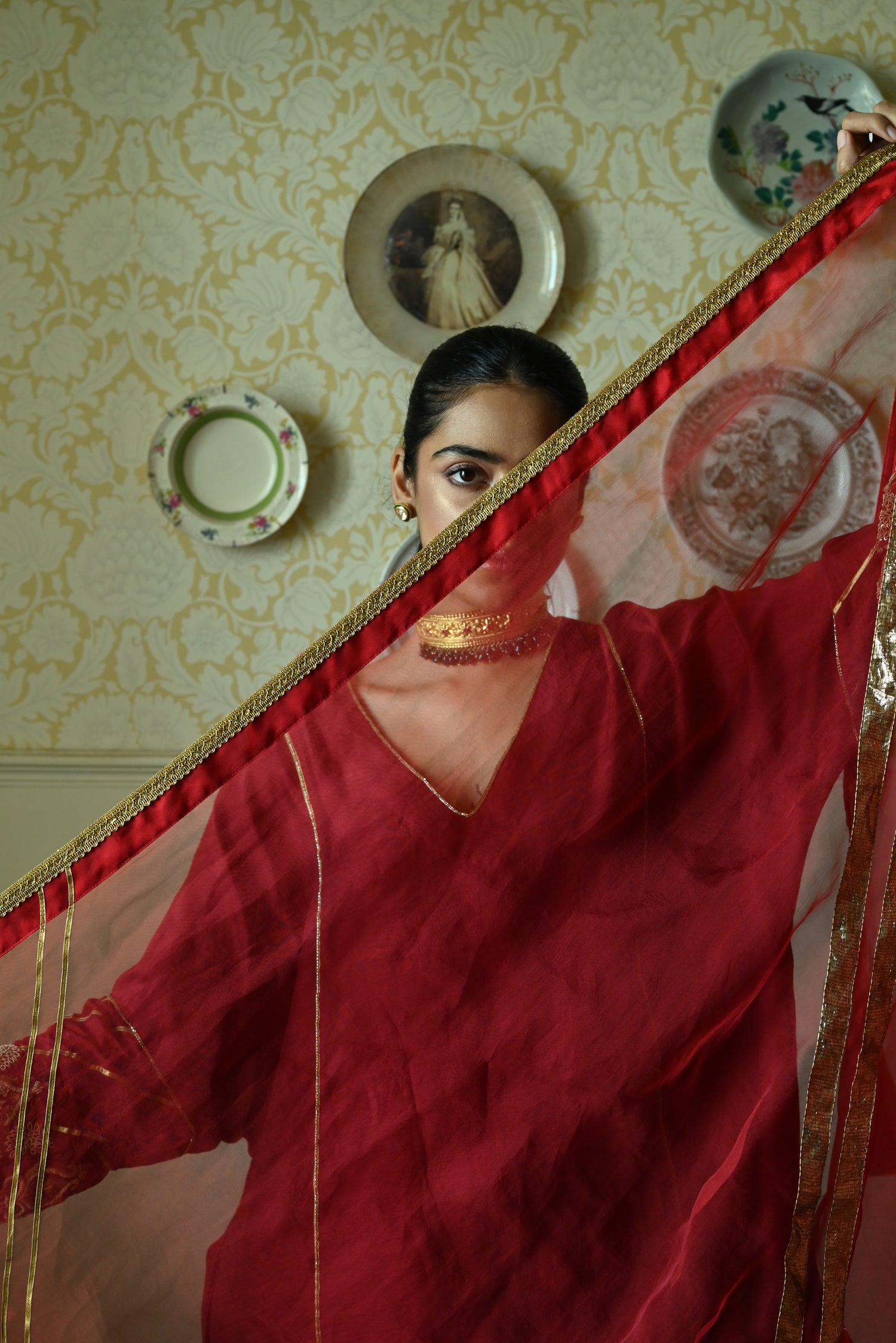 In this Diwali ,our elegant dupatta is crafted from lightweight and sheer organza fabric in a beautiful shade of red. The organza lends an ethereal and delicate quality to the piece, creating a graceful drape. The edges are finished with intricate lace, which adds a touch of classic sophistication and texture. This versatile accessory can be paired with both ethnic and contemporary outfits to add a pop of color and a feminine detail.
