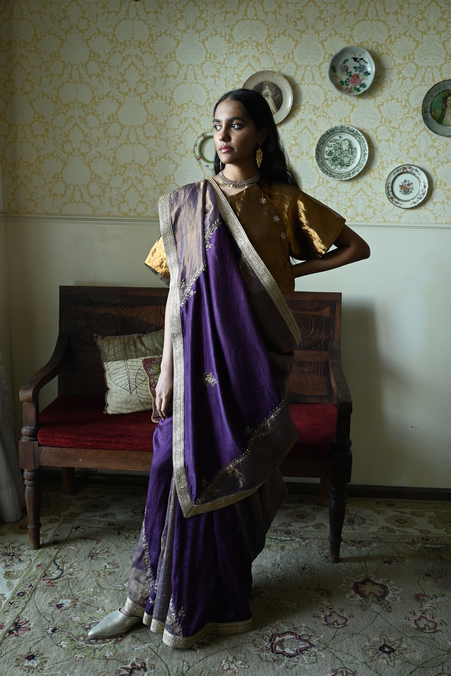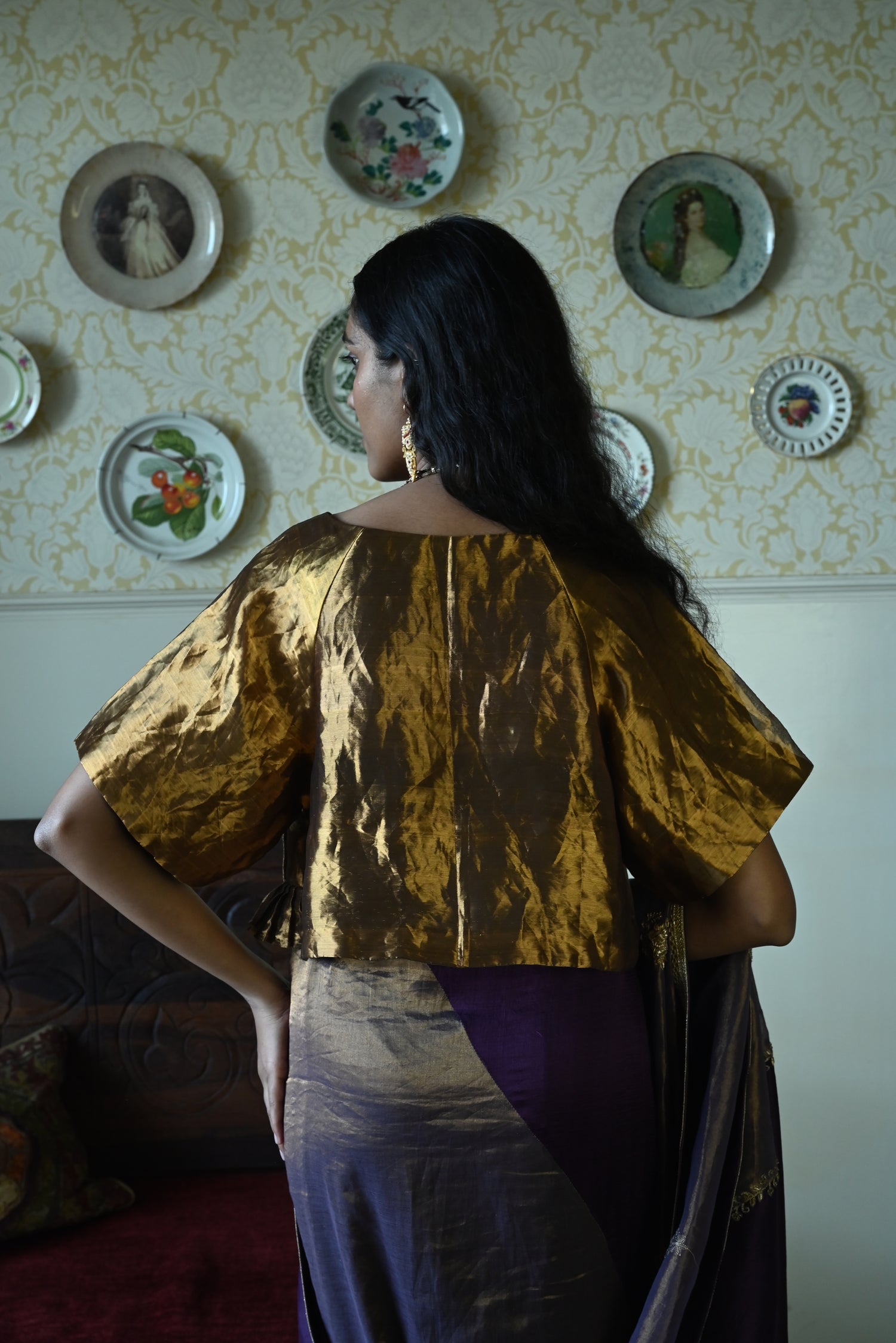 This stunning blouse is the perfect piece to add a regal touch to any outfit. Crafted from what appears to be a rich Gold tissue fabric, it has a subtle sheen that speaks of luxury. The modern, boat-style neckline is complemented by an elegant, asymmetrical button detail on the right shoulder, which adds a unique and sophisticated design element. The short, flared sleeves give the blouse a relaxed and contemporary silhouette, making it an ideal choice to pair with both sarees and lehengas.