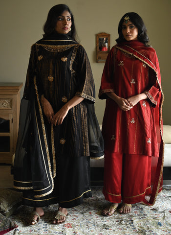 Here comes the beautiful Choga in Tussar khadi Stripe in the elegant colour of Black. Exquisite zardozi embroidery on yoke and armhole giving it a proper ethnic look. Pairing it up with our new Black flared Pant for a complete classy look.