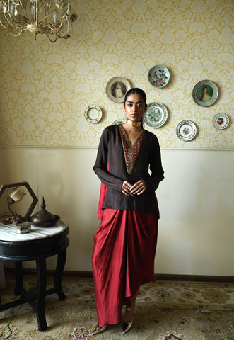 Chudi Shabana Red Kalis in Brown Silk with Red Cowl Skirt