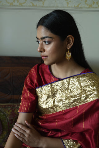 This stunning saree is a celebration of traditional design with a modern touch. The rich, red silk fabric is beautifully contrasted by broad, shimmering gold stripes that run horizontally across the drape, creating a bold and sophisticated pattern. The saree's border is also in a rich gold, with intricate detailing that adds a regal finish. This piece combines the luxurious feel of silk with a striking, contemporary design, making it an excellent choice for a festive occasion or a formal event.