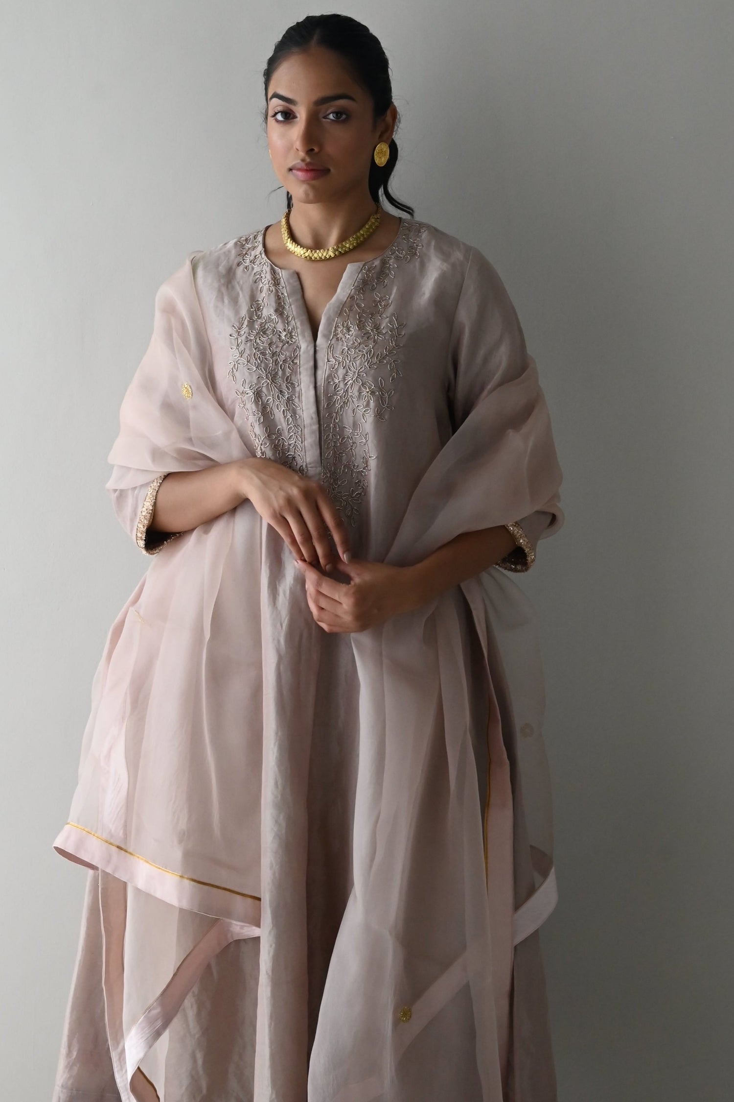 Here comes the elegant Dupatta in Nude Organza to pair up with your outfits to give the outfit a complete ethnic look. Embellished with lace trims and flower patches.