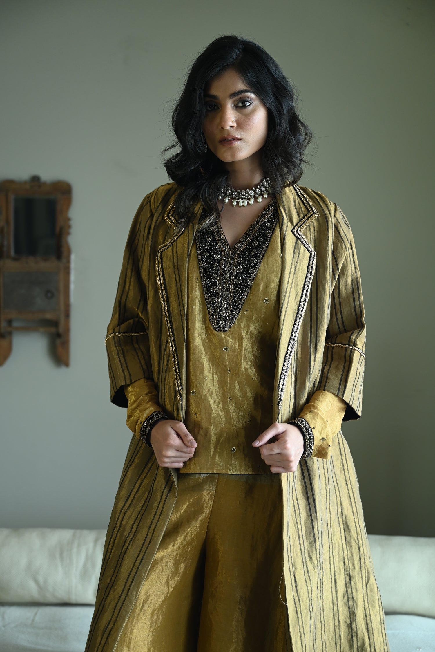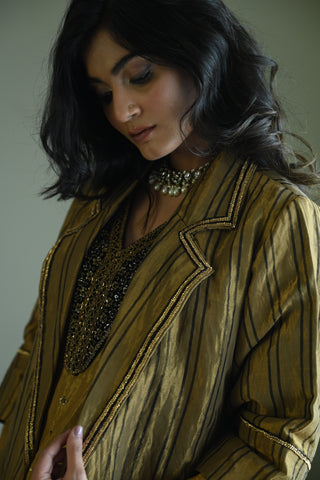 From Rumi our winter collection, comes the super elegant Sally Jacket in Gold Tissue making it a perfect outfit to celebrate Indian festivities.