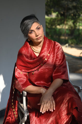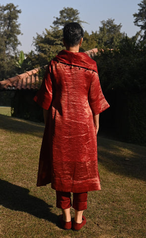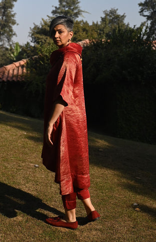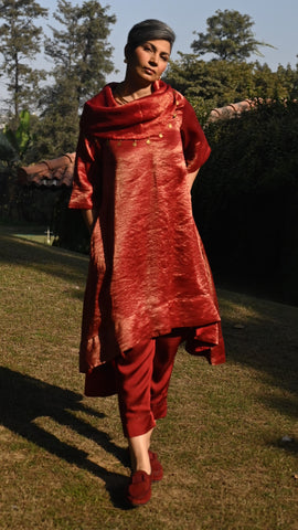 From Ranthambore, Shorshe’s new winter collection we bring you this elegant Sati Cowl Kurta made in Red Tissue and Chanderi stripes. Pairing it up with Red Satin Silk Pant to complete the look.