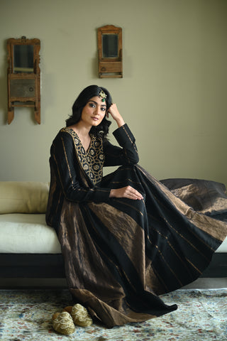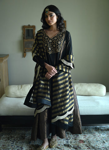 Tannu kurta in Black Tussar Khadi Stripe with Black Tissue Kali